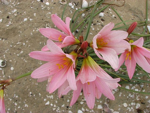 Rhodophiala ananuca grew abundantly in white sands between Huasco and Carrizalillo. Flowers ranged from white to a pronounced pink, usually with darker veins. Photo 1 shows Argylia radiata growing with Rhodophiala and Leucocoryne in the Huasco area.
