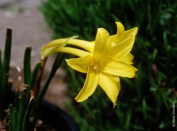 Chlidanthus fragrans Herb. is a species native to the Peruvian Andes. It is one of the most fragrant bulbous flowers, with a scent of citrus. It blooms in late spring or early summer. It has a reputation as a shy bloomer to many who have grown it. Suggestions from Alex Cespedes of Bolivia who has collected and published on the genus is that they come from a dry and cold habitat where they stay dormant for half a year (winter and spring) and only starts to bloom and grow with a flush of rain during late spring or early summer. These insights suggests that the bulbs should be put to dormancy for half a year under dry and cool conditions and watered after their dormancy period to stimulate blooming. Height range: 25-30 cm.