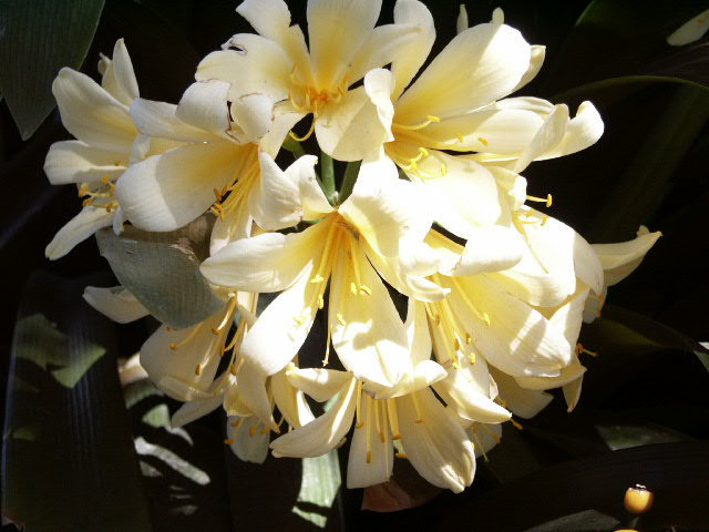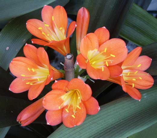 Clivias possess one more claim to fame: they are amazingly easy to grow. They prefer shade, which means that they thrive and flower in areas where other plants often languish. If you ever have a chance to visit the Getty Center in Los Angeles, one of the first things you'll note as you drive under the overpass which covers the entrance is that both sides of the entry are lined with Clivia miniata. These plants never see the sun, but were still in bloom in April! When discussing bulbs that can be grown in the shade, Jim Shields has found that Clivia caulescens and Clivia nobilis can tolerate sun, but also survive being grown in the shade. Clivias will grow happily even when root bound. Howard Koopowitz, who quite literally wrote the book on clivias, observed that they "will suffer much abuse and neglect, and on top of that they are difficult to kill." Such a plant deserves a place in every gardener's heart!