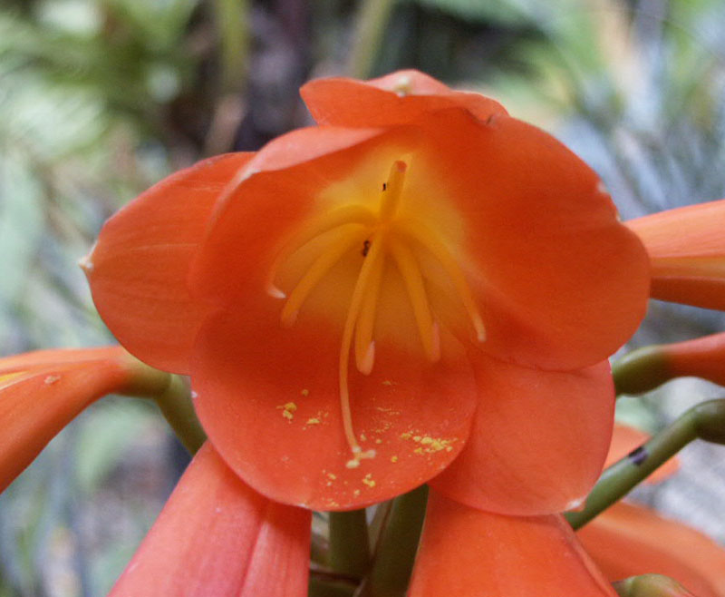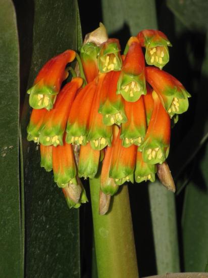 Clivia robusta B.G.Murray & al. was named in 2004 after genetic analyses of seedlings from seed of what had been considered a Clivia gardenii population were determined to be a new species. Clivia robusta grows in marshes in the tall closed canopy forest of Pondoland in the Eastern Cape of South Africa in sandy, acidic, highly leached soils. Some populations also grow in seepage areas on or below cliffs in humus-rich soils. This species also occurs in the southern coastal area of KwaZulu-Natal. As its name implies, this is one of the tallest members of the genus (1.6 m) with strap shaped, broad leaves and pendulous pale to dark orange flowers with green tips borne on reddish changing to green pedicels. When growing in very wet areas it develops buttress roots. Flowering occurs autumn to winter (late March to early August.) This is followed by round green ripening to orange-red berries containing up to 4 seeds that take a year or more to ripen. There is a yellow flowered form known as var. citrina.