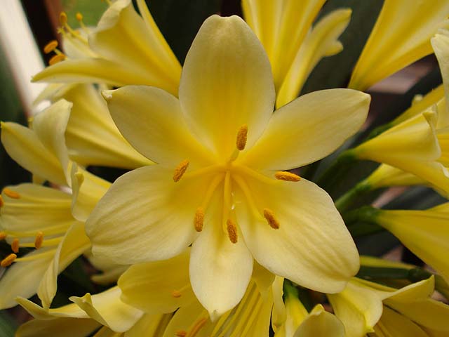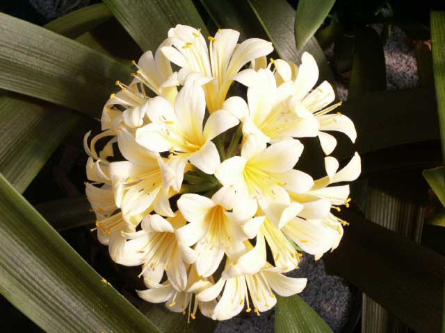 Clivia miniata 'Vico Yellow' was bred by Sir Peter Smithers and was one of the first tissue-cultured cultivars offered in the trade. It is a creamy pale yellow with a darker throat and is also known as 'Smithers' Yellow'. The first photo was taken by John Ingram. The rest of the photos were taken by Arnold Trachtenberg of a plant grown from an IBS tissue culture distribution in 2000. The second and third were of the first time they flowered in 2008.