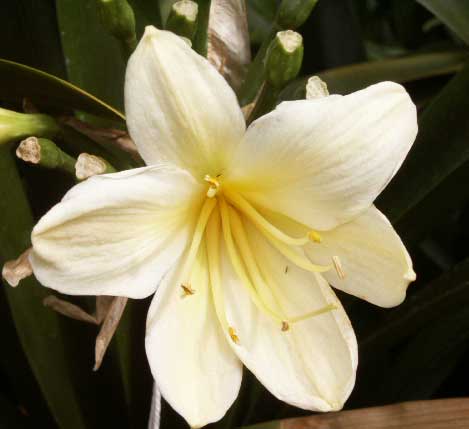 Clivia miniata var. citrina S. Watson has yellow flowers. The first photo was taken by Mary Sue Ittner who wrote: "In March 1998 I received two seeds of a yellow Clivia miniata. Both germinated and are blooming for the first time in March 2004 five years later." Photos 2-4 were taken by her in subsequent years. The last two photos were taken by Liz Waterman.
