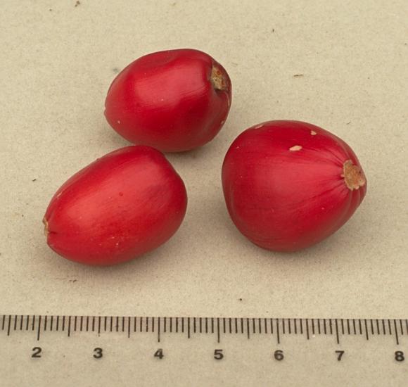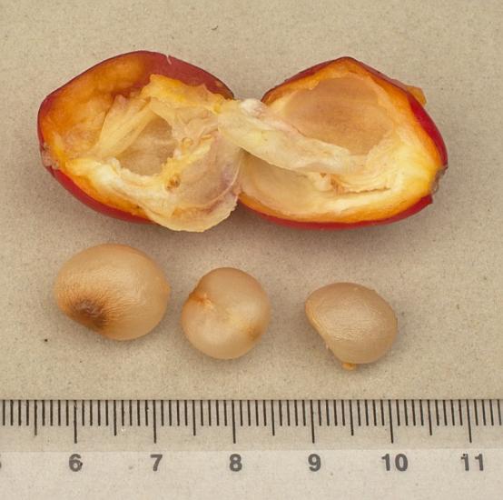 Photos by David Pilling, 1 is of the typical fleshy ephemeral amaryllid seed on a 10 mm grid and 2 shows the roots of one plant grown from the seeds. The remainder show fruit and contents.