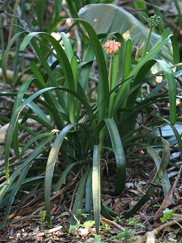 Clivia gardenii Hook. is an evergreen plant growing up to 60 cm. It is usually found growing in deep shade in forested areas and steeply sloping areas, cliffs and sometimes marshy spots. It comes primarily from KwaZulu-Natal, and has also been found in Mpumalanga and Swaziland. It has orange red hanging tubular flowers with greenish tips and exerted stamens and the fruit is a bright red fleshy berry. It is similar to Clivia nobilis but has fewer flowers, recurving tepal tips and leaves that taper to a pointed tip. There is much variation in plant size and flower color. Bloom time is fall into early winter. This species can tolerate fairly dry conditions. Photos by Alessandro Marinello and Hans Joschko.