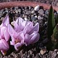 Colchicum sanguicolle K.Perss. is a species, little known to cultivation, that grows in the mountains of southwestern Turkey and is distinguished by the deep red prophyll (sheathing leaf) visible in one of the photos just above the soil surface. It grows among rocks and in short grass, but the largest colonies appear to be in duff just downhill and outside the drip line of large Cedrus libani (cedars). It is a medium-sized colchicum about 10 cm tall in flower. Photos by Jane McGary.