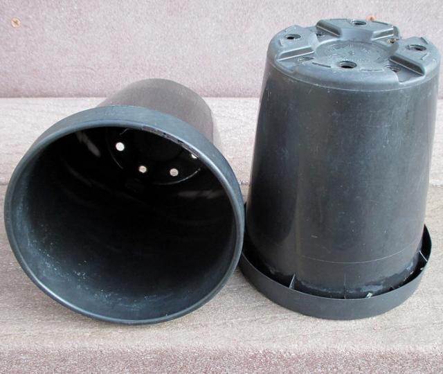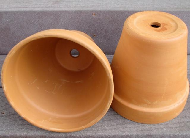 The photos display another common feature of pots, they have holes in the bottom to let excess water drain. An old belief is that drainage is improved by filling the bottom of pots with "crocks" (pieces of broken clay pots) or stones. This idea is now considered wrong (see this discussion). It is still OK to use a piece of old pot to make sure the hole does not get bunged up or to keep the potting medium in; however a piece of mesh, gauze or other material that allows the escape of water is better.