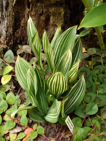 Photos below show forms that are different. The first one shows unusual variegated leaves and was photographed July 2007 at Plant Delights Nursery by Jay Yourch. The second photo taken by Giorgio Pozzi May 2008 is of a variety with pink flowers. Flowers are the same size as the white form and also smell the same. The third photo from Hans Joschko also is of a plant with pink flowers.