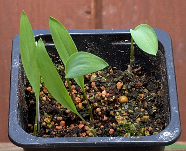 Photographs of seed. Photo 3 shows the same seed as photo 2, a couple of months later, apparently the seed has formed a bud and is waiting for another Winter before starting to grow. Confirmation of that is provided in the last photo which shows the seedlings the next year.
