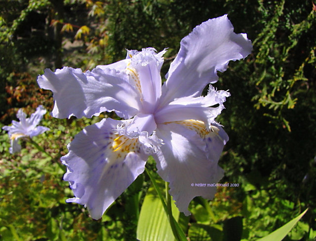 Iris japonica Thunb., native to Japan, is very common in cultivation and seen as both nearly all white or pale blue color forms. The foliage is semi-glossy and forms fans without any visible stem. There are many thin wiry rhizomes that can produce new fans a distance from the main plant. Usually the entire plant (less flower spike) is a foot + in height. Iris japonica is similar to Iris confusa, but the leaves are at ground level. It is very easy to grow in a Mediterranean climate with very little water in summer and poor soil as well. Although it is reported to be best in shade, in my Northern California coastal garden it may bloom a bit better in sunnier spots. Photos by Mary Sue Ittner.