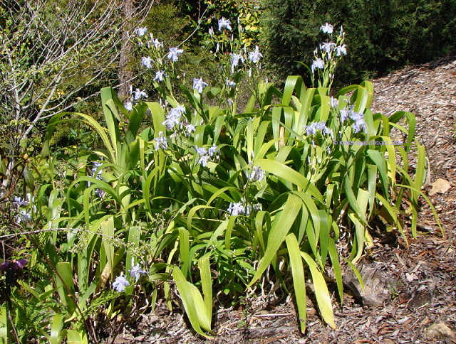 Iris 'Nada' - J.N. Giridlian of California hybridized I. confusa and I. japonica in 1936. The plant grows about 18 inches tall and the flower spike can reach to about 24 inches. Although each flower only lasts about two days, the entire spike will remain in bloom for over a month as new flowers open to replace spent blooms. It is very floriferous and each spike will produce about 25-50 flowers. The plant seems to enjoy growing in the shade in rich soil. It has never set seed for me, so it may be a sterile polyploid. However, this is not an obstacle for propagation as it easily spreads via underground rhizomes. Luckily, it doesn't seem to be overly weedy or aggressive. (note the small fans of leaves popping up around the base of the mother plant in the second picture) Pictures taken on January 15th in Mexico City at 7,500 ft by Dennis Szeszko.