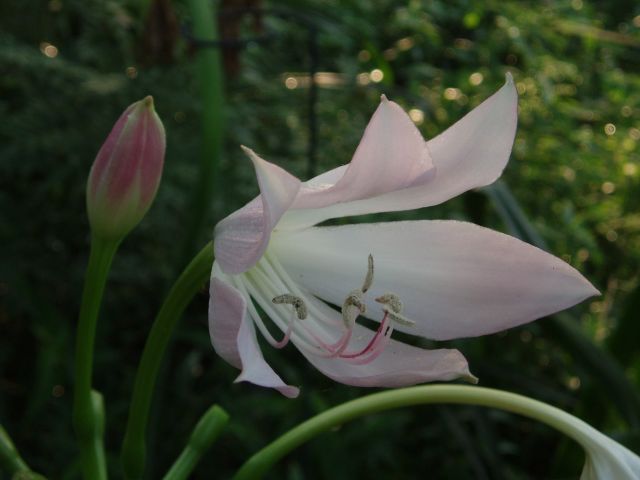 Crinum latifolium L. this is a form found growing in locations in south Florida. It is often considered a pale form of C. zeylanicum but differs from the darker C. zeylanicum in several ways. The plant is small compared to other Crinum and is much more low and spreading in growth with a tidy rosette. It has the strong rib on the underside the foliage The short leaves form a rosette almost flattened on the ground and is similar to the C. album in texture and habit. The flower scapes are glaucous, only slightly pigmented, and to 60 cm tall. Flowers open in the late afternoon and are quite fragrant while open at night. However, they only last a night & are wilted by dawn of the next morning. This unlike the dark C. zeylanicum form which looks good for 2-3 days. The flowers in bud have a pale pink stripe outside, the interiors may have a pink stripe as well or may be pure white. This species sets seeds easily, whether selfed or cross pollinated. It is possible that this form, whatever its true origins, is involved in the mysterious origins of some classic hybrids such as Peachblow, Alamo Village, & Louis Bosanquet. The third picture was taken at 7:00 AM demonstrating one of the drawbacks of this type. Photos by Alani Davis.