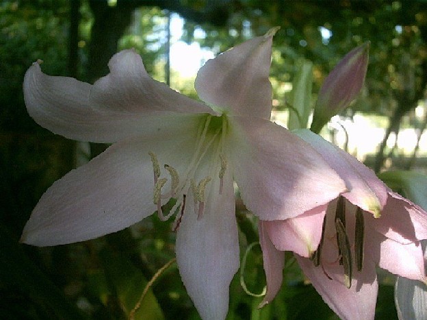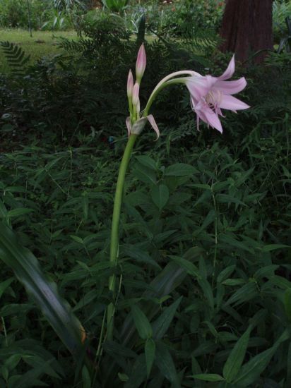Crinum moorei Hook.f. is native to forested areas in South Africa. It prefers shade from hot afternoon sun and may go dormant during periods of excessive summer heat or drought. Height range: 3-4 ft. Photos of a closeup of 'Alba', a clump in flower taken at an old church in Plymouth, Devon, and old tight clump originally planted in the late 19th century in Brixham, Devon by David Fenwick. The fourth photo of normal pink form by Angelo Porcelli. Angelo says the flowers are darker than shown in the photo. The last photo is a habitat picture taken near Kei Mouth, Eastern Cape by Andrew Harvie.