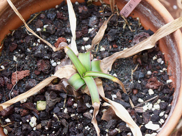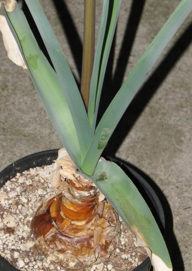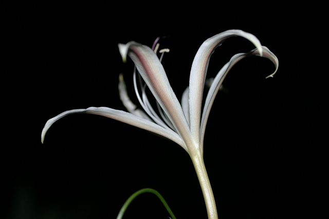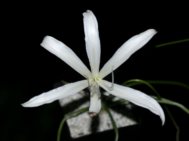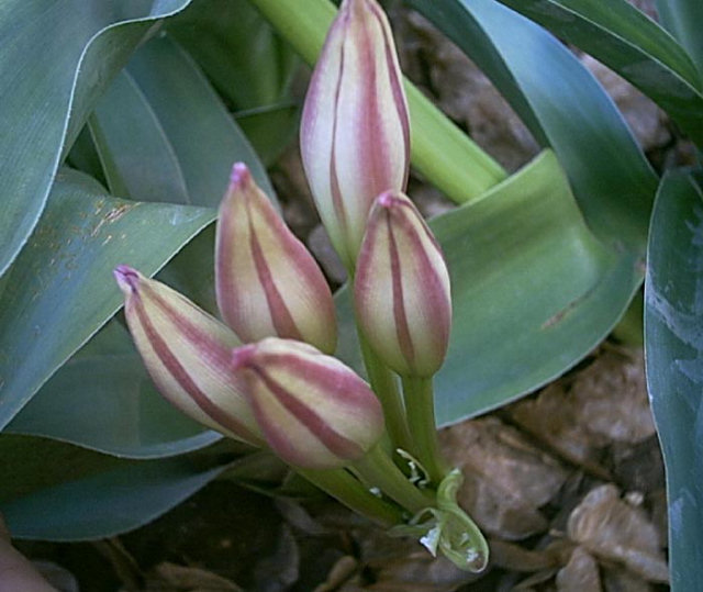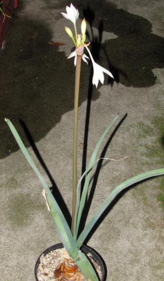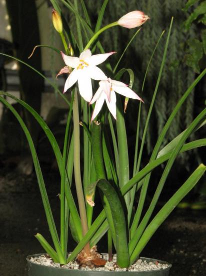 Crinum mccoyi Lehmiller is a recently named species collected in an area of white marble outcroppings near Ambatofinandrahana, Madagascar by Tom McCoy in April 2003. It has attractive, compact, narrow, arched foliage and spidery, white flowers with irregular pink stripes and a purplish red style and filaments. Height range: 2-4 ft. Photo 1 was taken in August 2007 by Jay Yourch. Photos 2-6 taken by Uluwehi Knecht are of a plant originally obtained as an unnamed species from Itremo, Madagascar. Robert Hamilton with confirmation from Dave Lehmiller have tentatively confirmed its identity. I had the plant for 4 years but recently gifted it to a friend who has another clone, in order for it to be propagated since it appears to be self sterile. In the time that I grew it, it never went completely dormant but would start and stop at unpredictable intervals throughout the year. Depicted in the first photo is an example of this peculiar phenomenon. I called it 'pseudo-dormancy', since it would keep a core of dwarfish green leaves until it decided to burst into long strappy growth again. It bloomed just once in September of 2006. The flowers, upon opening only lasted one day. They were thin and delicate, with no detectable fragrance. Grown in Honolulu, Hawai'i.