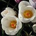 Crocus chrysanthus 'Prins Claus' was described by Mark McDonough. He wrote: "perhaps my absolute favorite C. chrysanthus selection, this one has pristine white flowers marked deep purple on the outside. The sumptuous flowers are goblet-shaped with rounded tepals, wafting an enticing spicy-sweet scent. The four photos depict a clump that's about 10 years old in which there's barely enough space for the flowers to open. In many years the flowers are trashed by bad weather, but when they make it, it's worth the years of waiting." Photos by Mark McDonough. The fourth photograph is an overhead view of the floriferous clump taken March 29, 2003. The day after taking this picture, it poured rain, followed by 1-1/2 weeks of ice, hail, snow, and more rain, which more or less finished off this year's display. The last photo by Martin Bohnet shows the purple markings, making this a very attractive crocus on not so sunny days.