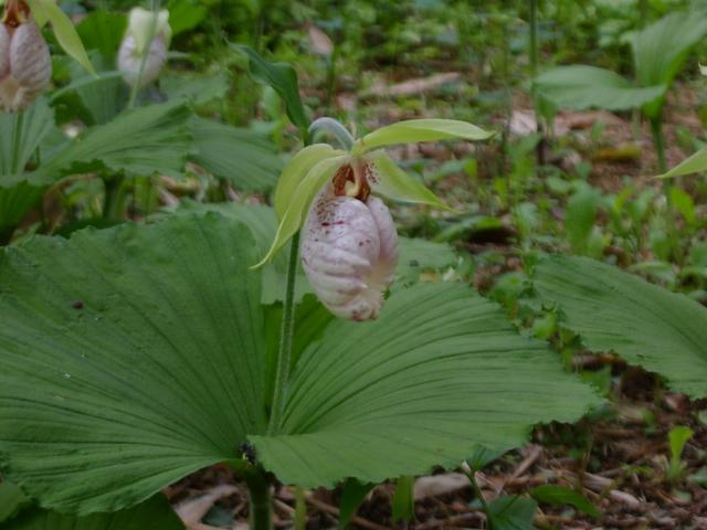 Cypripedium japonicum Thunb. is found in wet areas of cool mountain forests at 1000 to 2000 m in Japan. It is also found in Korea and China. The Japanese name is 'Kumagai-Sou'. Height range: 20-33 cm. Photographs taken in Japan by Mari Kitama.