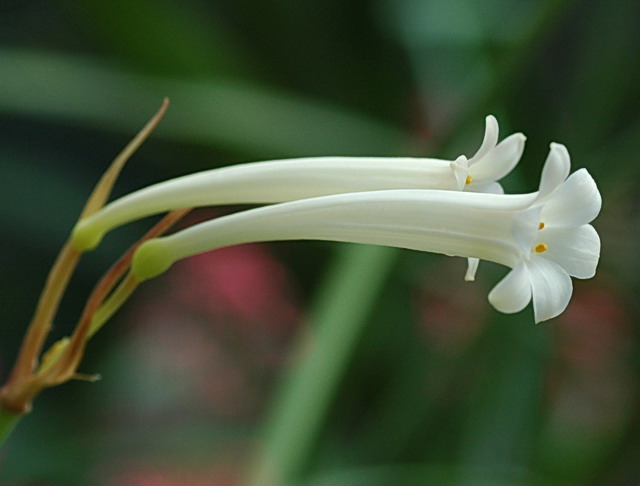 Cyrtanthus leucanthus Schltr. grows on sandy and rocky flats in the southwest Cape from Betty's Bay to Potberg, flowering January-March. It has grasslike foliage that appears after flowering, a hollow stem and pale cream scented long tubed flowers. It is another species stimulated to bloom by fires. Height to 30 cm high. You can find a short article here. Photos from iNaturalist taken in February and March by carinalochner, Jenny Parsons, and magrietb and shared under a CC BY-NC license.