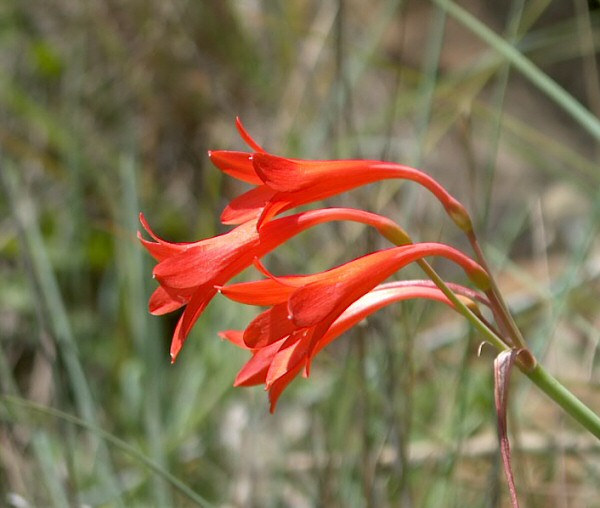 Cyrtanthus macmasteri Snijman was described in 2003. It has large red flared flowers and was named after Cameron McMaster who saw a specimen in 1994 when with his family in the Bolo River Gorge in the Eastern Cape. He did the follow up work to locate where it grew and to obtain specimens so the necessary documentation could be done so it could be verified and named. He has kindly provided an article first published in Veld and Flora, March 2004, about this experience. The original article with different larger photos is here. This species grows in thick grass between rocks on steep slopes, often shaded by shrubs and trees. It blooms in the wild in February and March. Height: to about 25 cm. Photos by Cameron McMaster of the flowers and the habitat.