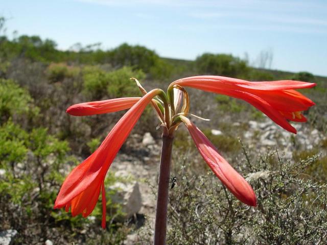 Cyrtanthus guthrieae L.Bolus is an extremely rare species with bright red flowers that reflect a golden sheen in the sun. It is not too difficult to grow and with constant attention to avoid over-watering, it flowers faithfully every March-April in the Southern Hemisphere. It is dormant in summer, but may occasionally be evergreen. Height: about 15 cm high. This species is native to the lower sandstone slopes in the southwest Cape, flowering after fires. It is one of the rarest in South Africa, occurring in very localised spots in fynbos on the lower southern slopes of Soetmuisberg near Bredasdorp. It is known locally as the Bredasdorp lily and it occurs nowhere else in South Africa. Photos by Cameron McMaster who counted only 15 blooms when he visited the site to obtain these pictures of it in habitat and increasingly closer. The last is another close-up showing it flowering next to some large rocks.