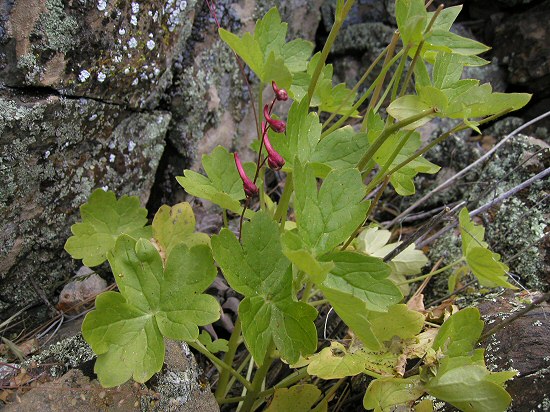 Delphinium purpusii Brandegee is found on dry rocky slopes in chaparral and foothill woodland in Kern County, California. It blooms from April to May. Growing from a deep-seated woody-fibrous rootstock, it has rose pink flowers. Height range: 2-4 ft. Plants photographed by Mary Sue Ittner were blooming April 2005 in the wild on a rocky slope in Kern County.