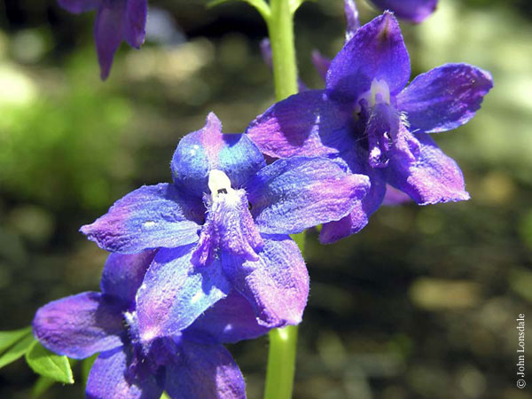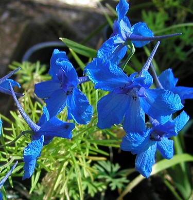 Delphinium spp. are unidentified species. The first was grown from NARGS seed identified as Delphinium menziesii but it is not this species. I have been unable to identify what it is, but it has gorgeous blue flowers, is briefly deciduous late summer, early fall, and blooms in summer. Photos below by Mary Sue Ittner and Bob Rutemoeller show the leaves, flowers, and the geophytic nature of this unidentified species (on a 1 cm square grid). It has been suggested that this plant could be Delphinium chinense which is usually grown as an annual. Mine did not die over many years, but were best the first year and eventually did not reappear.