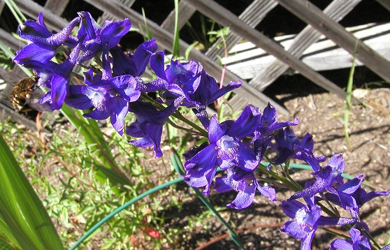 Delphinium patens Benth. is a species with tuberous roots and dark purple flowers found in grassy areas in the coastal mountains of California. The spur points upward. Height range: 20-50 cm. The first two photos below were taken by Nhu Nguyen. The last photo of the tuberous roots shown on a 1 cm grid was taken by Mary Sue Ittner.