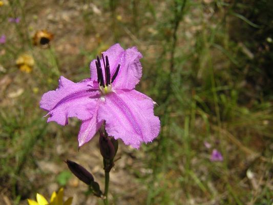 Dichopogon fimbriatus (R.Br.) J.F.Macbr., syn. Arthropodium fimbriatum R.Br., is found in a number of Australia states (New South Wales, South Australia, Queensland, Western Australia, and Victoria) where it grows in grassland, woodland, and forests. It usually grows in sandy soils in areas of moderatly low rainfall. Growing from .2 to 1 m high, the blue to violet flowers are nodding in fruit and usually unbranched. There are 2–6 flowers per bract. Known as the nodding chocolate lily, the flowers are vanilla or chocolate scented. Flowering time is from September to December. This species has fibrous roots ending in tubers. Photos from Dirk Wallace.