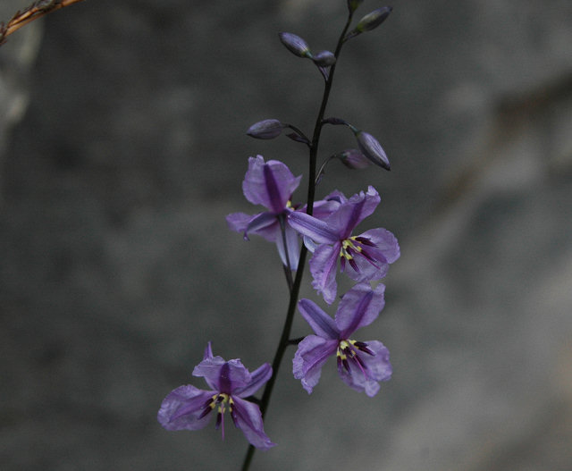 Dichopogon tyleri Brittan is native to Western Australia where it grows in a variety of soils. It grows to .6 m high and has purple flowers and anthers with four appendages.