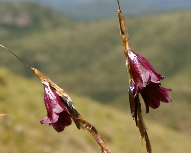 Dierama atrum N.E.Br. is endemic to the Eastern Cape where it is found growing in grasslands, mountain slopes and forests. Plants occur as solitary stems or small tufts from 75-125 cm tall with narrow leaves and deep maroon bell shaped flowers. Photos were taken by Cameron McMaster in January and February (summer) in the Eastern Cape.