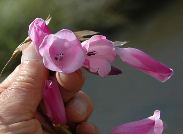 Dierama erectum Hilliard is native to KwaZulu-Natal where it grows in wet grassland near streams. Growing in clumps up to 1.5 m, it has light magenta pink flowers with eyes at the base of each tepal in an erect inflorescence. It flowers in April. Photo from Rod Saunders.