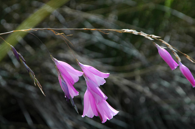 Dierama pendulum (L.f.) Baker is the only member of this genus that is in a winter rainfall area. It grows on rocky, loamy clay or sandstone slopes and flats in the southeastern Cape (an area that gets year round rain). Growing from 70 to 110 cm, with a slender and wiry stem and linear leaves, it has pink nodding flowers in drooping spikes and flowers Oct-Dec. The first four photos from iNaturalist were taken by Nicola van Berkel on the Suurberg Pass in October and shared under a CC BY-SA license. The last photo is a white form of this species photographed and flowered by Rob Hamilton in early summer.