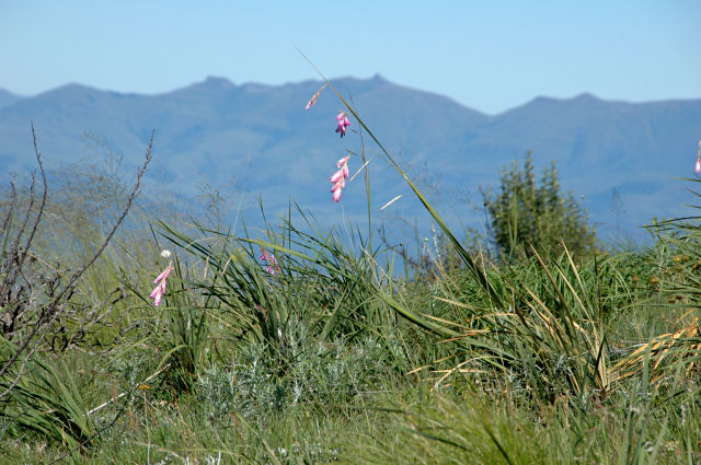 Dierama grandiflorum G.J.Lewis is confined to a small area of the Bosberg near Somerset East. Cameron McMaster wrote about the need for protection for this species in an article he wrote for Farmer's Weekly in 2008. Height range: 4-5 ft. The first photo was taken in early spring by Rob Hamilton. The second photo is from Ellen Hornig.