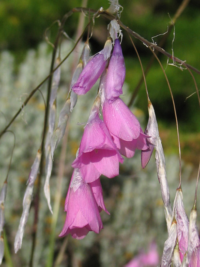 Dierama pulcherrimum (Hook.f.) Baker is an Eastern Cape South African species that is more or less evergreen and grows to 1.6 meters in open, stony grassland. It has magenta pink to reddish purple bell-like flowers on wiry stems. It is summer flowering. Photos below from Bob Rutemoeller and Mary Sue Ittner taken in the Eastern Cape including Gaika's Kop January 2010.