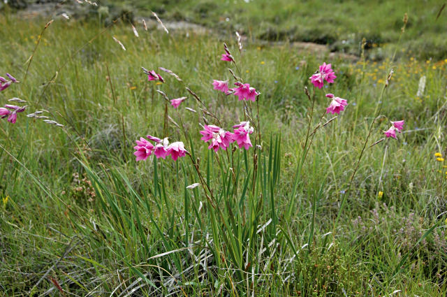 Dierama pauciflorum N.E.Br. is found in clumps in marshy ground or forming tussocks in water, or singly on drier ground from the Eastern Cape to Zimbabwe. The paucity of flowers on this species is made up by its intense colour (pink to reddish). Height range: 30-40 cm. The first photo was taken by Rob Hamilton in early summer of a plant he is growing. Photos 2-4 from Cameron McMaster, Mary Sue Ittner, and Bob Rutemoeller taken January 2010 at Naude's Nek.