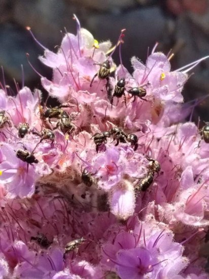Dilatris corymbosa P.J.Bergius is found on damp sandy slopes and flats in the Western Cape. It is often seen after fire in the Western Cape mountains. Growing 40-60 cm high, it flowers from August to January. The flowers are mauve in a flat-topped cluster with hairy lanceolate tepals. Stamens are about as long as the tepals and the large anther more than twice as long as the smaller. The first four photos from iNaturalist were taken by Tony Rebelo in November in the Western Cape and shared under aCC BY-SA license. The last photo of the flowers with monkey beetles was taken by Bernhard Frauenknecht at Bains Kloof December 2023.