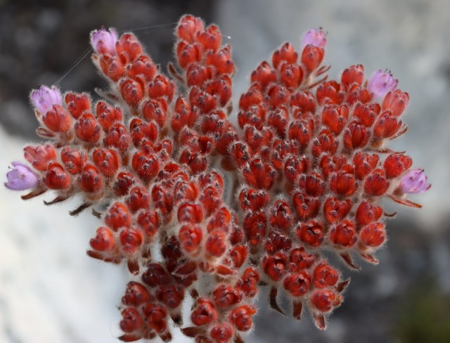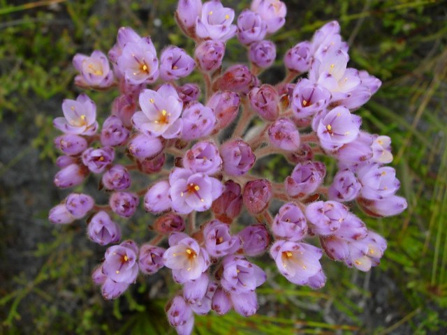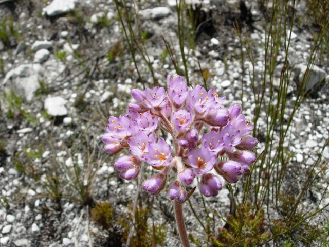 Dilatris pillansii W. F. Barker is found on rocky sandstone slopes from the Cedarberg Mountains to Agulhas. Growing from 20 to 45 cm high, plants have a whitish hairy stem, linear oblong leaves and mauve flowers in a rounded cluster. Stamens are included or scarcely exserted; longer stamens are much shorter than the tepals. Plants flower August to January. The fruiting capsule is topped with a conspicuous papery perianth that fragments to release the single seed. Photos by Cameron McMaster taken in the Overberg. The last photo was taken by Christopher Whitehouse.