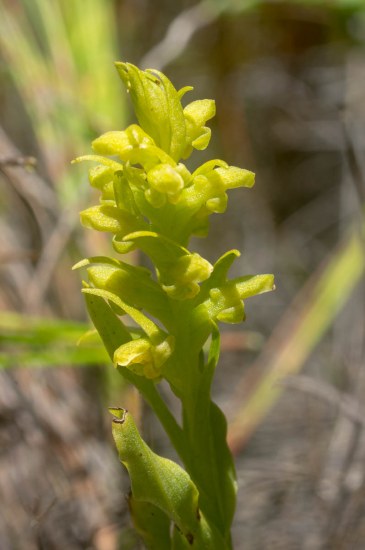 Disa cylindrica (Thunb.) Sw. is species that grows from 7 to 34 cm and has yellow-green flowers that are almost spurless and blooms after fire. It is found in seeps or damp sandstone slopes from the western Cape to the Eastern Cape (Tulbagh to Cape Peninsula to Humansdorp.) The first three photos by Cameron McMaster were taken near Napier in the Overberg. Fourth photo by Christopher Whitehouse, taken at Phillipskop Mountain Reserve near Stanford.