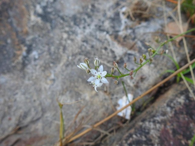 Drimia calcarata (Baker) Stedje, syn. Urginea calcarata (Baker) Hilliard & B.L.Burtt, syn. Drimia loedolffiae Van Jaarsv., is widespread through temperate southern and southeastern South Africa, ranging from the Eastern Cape to Limpopo, Lesotho, and Swaziland, and north into east tropical Africa where it grows in seasonally damp grassland in seeps and rock flushes and on moist cliffs, sometimes on rocks along streams. The small flowers are white with green or brown keels. Leaves are erect or arching and terete. Height range: 20-30 cm. Photos from iNaturalist were taken by Rob Palmer in June at Uvongo Beach in KwaZulu-Natal and shared under a CC BY-SA license.