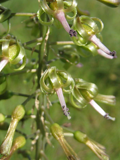 Drimia macrocentra Baker, syn. Urginea macrocentra (Baker) Jessop, is a rather strange plant known colloquially as the 'snake's head' (Slangkop) as its sinuous inflorescence is said to resemble the flared hood of a rearing cobra. The hollow, deep green cylindrical leaves are very striking when encountered in the moist grasslands of the Drakensberg foothills of KwaZulu-Natal where summer temperatures are cool. Height range: to about 3.5 ft. The first two photos from iNaturalist were taken by ansell in the Mkhomazi Wilderness area, South Africa, in November and shared under a CC BY-NC license. The last photo is a habitat photograph by Rogan Roth.