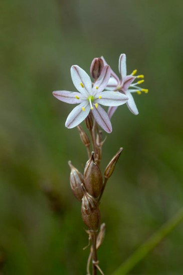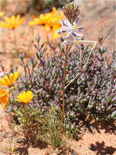 Drimia dregei (Baker) J.C.Manning & Goldblatt, syn. Urginea dregei Baker, syn. Fusifilum dregei (Baker) Speta, is known from the mountains and flats around Cape Town, but recorded northwards along the Cederberg to the Bokkeveld Escarpment and the Kamiesberg in Northern Cape and eastwards to the Langeberg in the Western Cape. It is found on seasonally wet or inundated flats and seeps. Flowers are inconspicuous and open only in the afternoon in mid summer (January-March) during the dry season; they are white or pale pinkish brown with a darker dorsal stripe. Height: 15-30 cm high. Photographs were taken by Christopher Whitehouse at Phillipskop Mountain Reserve near Stanford in South Africa.