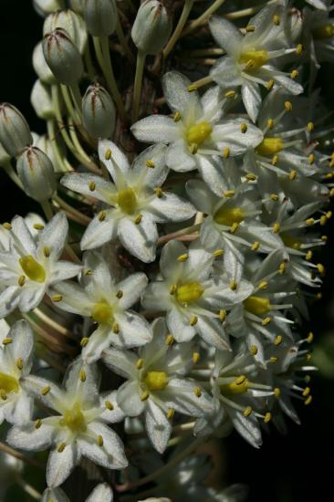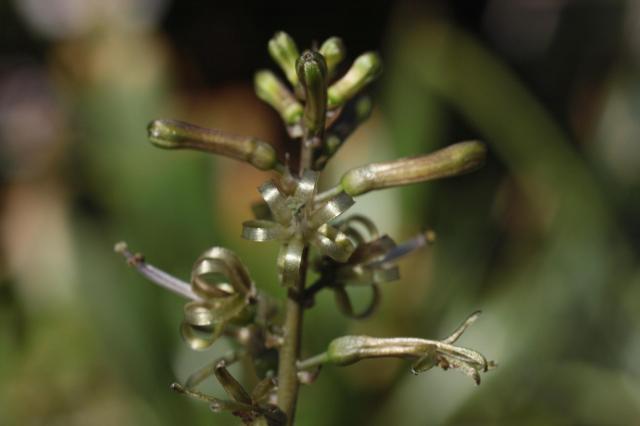 Drimia capensis (Burm.f.) Wijnands is found in mostly clay but also in deep red sands and limestone from southern Namaqualand to the Eastern Cape. It grows from 1 to 2 meters high. Bulbs become very large and are underground or partly exposed. The slightly undulated large leaves are dry at flowering. Flowers are white to yellowish with green keels. Photos were taken by Cameron McMaster in the Overberg.