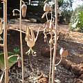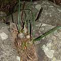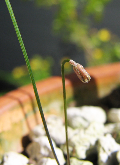 Photos below show: 1) tiny black seeds, 2) seedlings, 3) the leaves, 4) buds, 5) flowers, and 6) empty pods. After dormancy, I brought the plant indoors where it started to bloom and form seeds without any pollinator. I only have one plant so the plant must be self-fertile. Notice the plant's size relative to the pumice particles. The leaves are tiny, although the bulb is sizable.