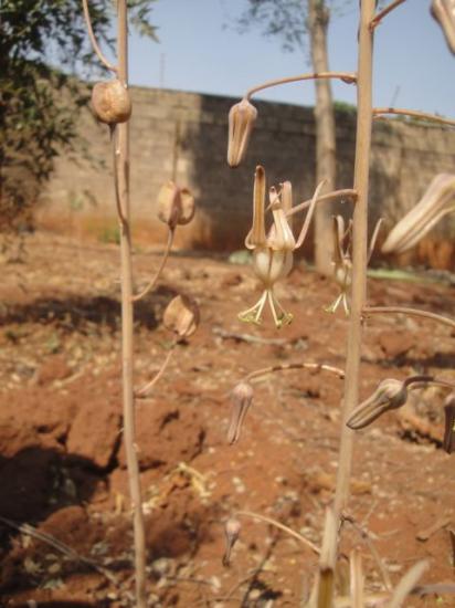 Drimia indica (Roxb.) Jessop, syn. Urginea indica (Roxb.) Kunth, syn. Drimia zambesiaca (Baker) J.C. Manning & Goldblatt, syn. Urginea zambesiaca Baker, ranges from the coastal parts of northern KwaZulu-Natal and northern Namibia through east and central tropical Africa to Mauritania, and India. Height range: 15-45 cm. The inflorescence appears in mid to late July in Zambia with the flowers opening in succession up the stem about a month later. Seed pods ripen and shed seeds before the start of the rainy season and only then do the leaves emerge as the rains start. Bulb scales are easily separated and used to propagate new plants as done with Lilium. (See Lilium bulbs for an example). Photos were taken by Nicholas Wightman near Lilayi, Zambia.