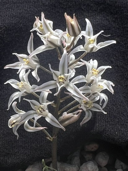 Eriospermum paradoxum (Jacq.) Ker Gawl. is a widespread species distributed from Namaqualand south and east to Grahamstown where it grows in sandy and clay soils. Growing to 10 cm, it has interesting leaves. The single erect leaf usually produced in autumn before the flowers appear in winter (April to May), has many branched hairy, wooly outgrowths. Flowers are white, fragrant, and star-shaped with green or brownish lines on the petals. The first photo from Uluwehi Knecht of a plant he grew. The second photo from the book Plants of the Klein Karoo is courtesy of Jan and Anne Lise Schutte-Vlok. The last photo from Cameron McMaster was taken in Namaqualand.