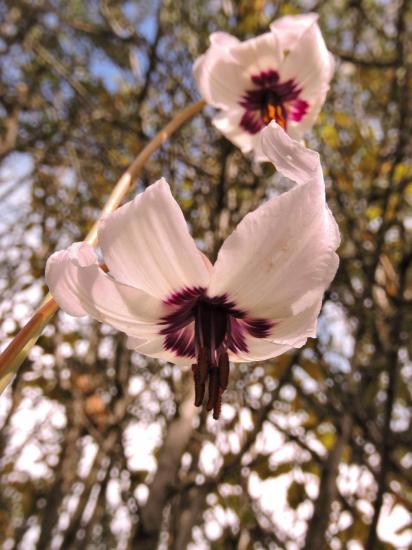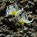 Erythronium helenae Applegate is a rare species found in dry serpentine soils in oak and pine woodland and chaparral in Napa and Sonoma Counties, California. It appreciates warmth during its summer dormancy. Leaves are mottled and it has large white widely opened flowers with a yellow base, yellow anthers and auricles at the petal base. On warm days it smells of orange blossoms. Height range: 30-45 cm. First photo by Ian Young. Photos 2-5 were taken by Mary Sue Ittner. Photos 2-3 show plants in cultivation grown from seed and 4-5 are of plants seen growing on a gravelly bank in Lake County very close to Sonoma County.