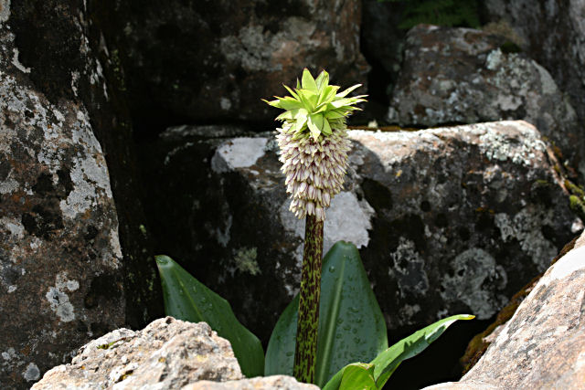 The first three photos are of pot-grown plants from specific areas, including one that shows the detail of a flower. The first, the Kei Bolo form of Eucomis autumnalis is the latest to flower - flowering in late April to May. It occurs naturally at altitudes of 700 m in the transition between Valley Thicket and Grassland on the slopes above the Kei River Valley in the Stutterheim district of the Eastern Cape. It is found between rocks and in rock crevices, protected from harsh sun and wind. The Triple Streams form of E. autumnalis pictured in the second two photos comes from glades within patches of Afromontane forest in the Stutterheim district of the Eastern Cape where it grows in mottled shade. Photos from Cameron McMaster.