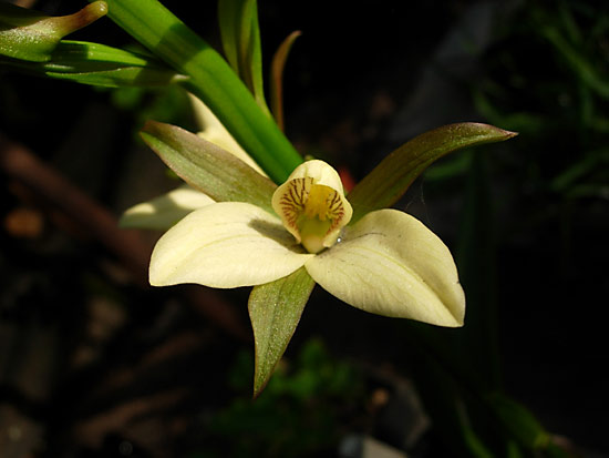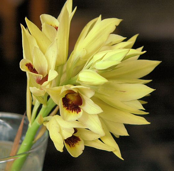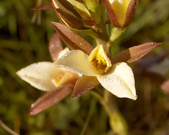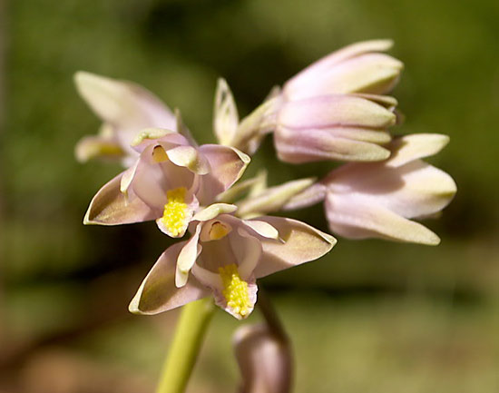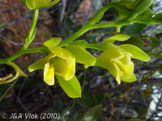 Eulophia herbacea Lindl. is a summer growing, winter dormant (deciduous) species native to southeast Asia. The plant in the photos is about 10 inches (25 cm) tall and the flowers are about 1 inch (2.5 cm) wide. Photos taken June 2011 by Eugene Zielinski.