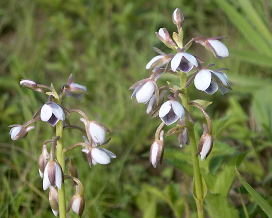 Eulophia leontoglossa Rchb.f. is widespread in Eastern southern Africa where it is found in moist to wet grassland. It is known as the Lion's Tongue or the Lion's Tooth Orchid. It has nodding white to yellow or pink tinged green sepals and petals. Tepals do not open very widely. Height range: 60-90 cm. Photos from Cameron McMaster and Mary Sue Ittner taken near Maclear January 2010.