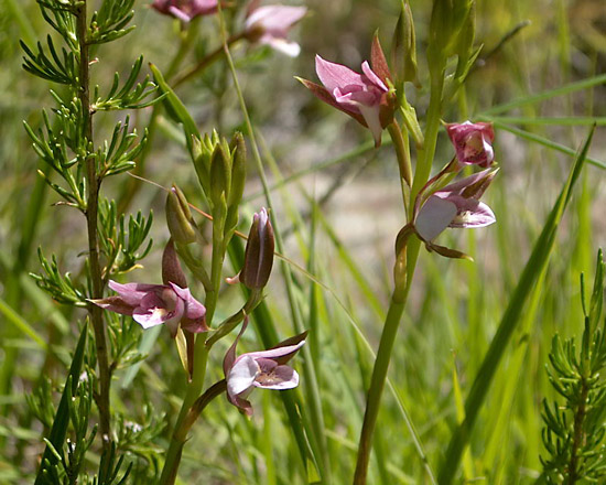 Eulophia ovalis Lindl. is a deciduous rhizomatous geophyte to 69 cm tall. It is found on dry or marshy grassland and bushveld from the Eastern Cape to tropical Africa. Flowers are purple and white or cream to lilac. The lip has fleshy, peglike outgrowths. Photo by Cameron McMaster.