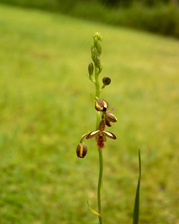 Eulophia parviflora (Lindl.) A.V.Hall is found in the Eastern Cape in grassland, coastal thornveld, and rocky slopes. It is pleasantly scented with brown and yellow flowers. Height range: 20-50 cm. Photo by Cameron McMaster.