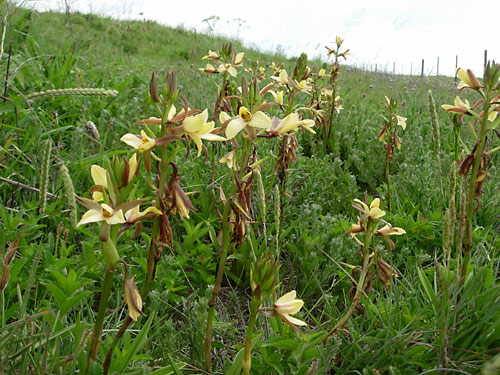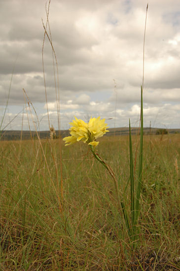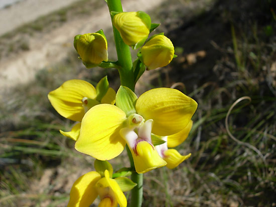 Eulophia ensata Lindl. is found in grassland and open bushveld, often coastal, from the Eastern Cape to the Northern Province. Growing to 1 m tall, it has pleated leaves on a separate shoot and few to many pale to bright yellow flowers in a dense spike. Photos 1-4 taken by Bob Rutemoeller and Mary Sue Ittner in grassland in the Eastern Cape, January 2010. The last photo was taken by Mary Sue Ittner in the bulb room at Kirstenbosch National Botanical Garden where they obviously are flowering it successfully.